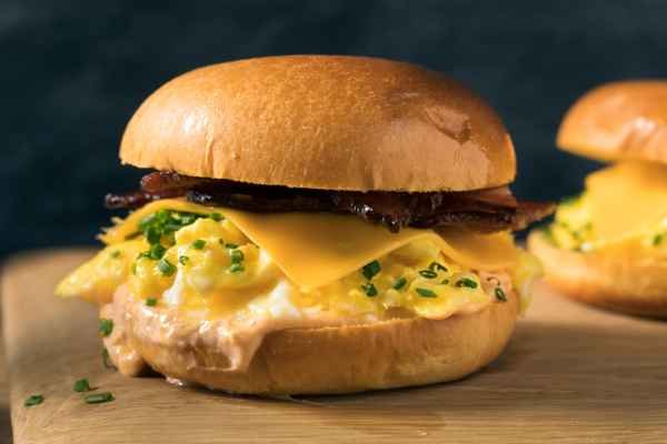 A classic sandwich featuring crispy bacon, a fluffy runny egg, sesame aioli, and melted American cheese, all nestled between a brioche bun.