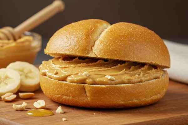 A peanut butter sandwich is a classic, simple, and satisfying meal. It features creamy peanut butter between two slices of bread roll.