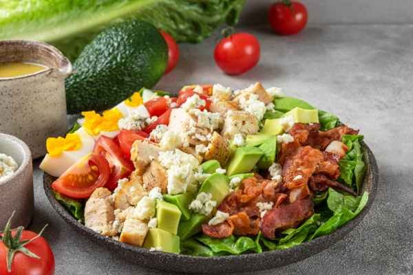 Grilled chicken, bacon, Romaine lettuce, tomato, peppers, onion, cucumber, boiled egg, avocado & cheddar cheese.